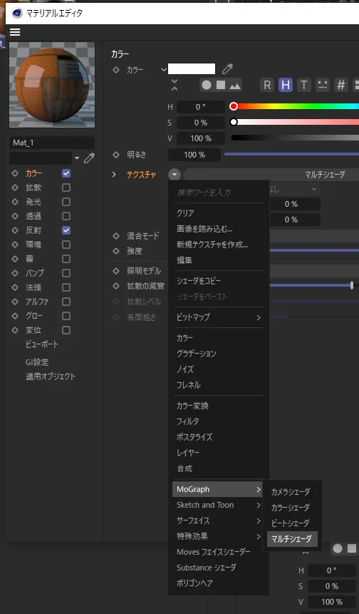 マテリアル > カラー > テクスチャの逆三角をクリックして Mograph > マルチシェーダ をクリック