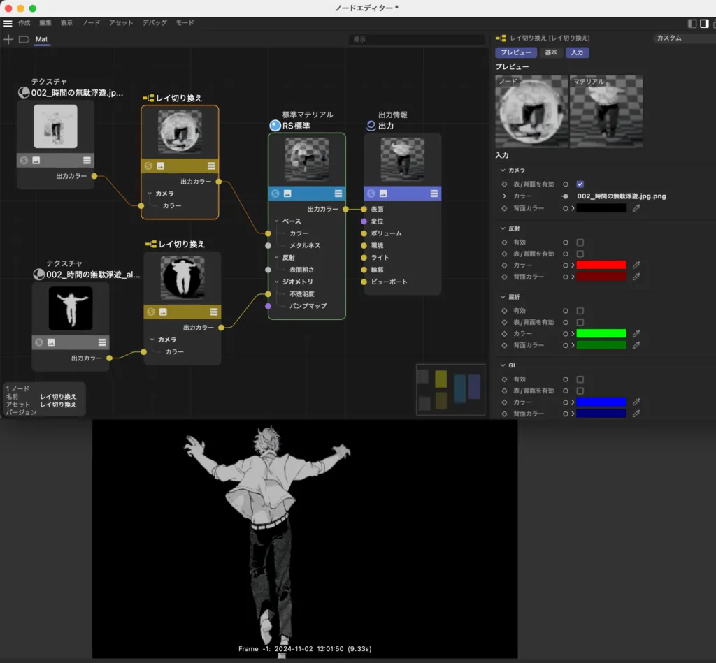 - TIFFで書き出したキャラの透過画像をノードエディタにドラッグ&ドロップ(アルファ付きとアルファのみの2つ)