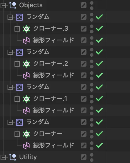 ヌルの中にオブジェクトを複数入れて、そのヌルをクローナーで複製してからランダムエフェクトを適用したときに、ヌルごとにランダム化するのではなく、ヌルの中のオブジェクトごとにランダム化させる方法