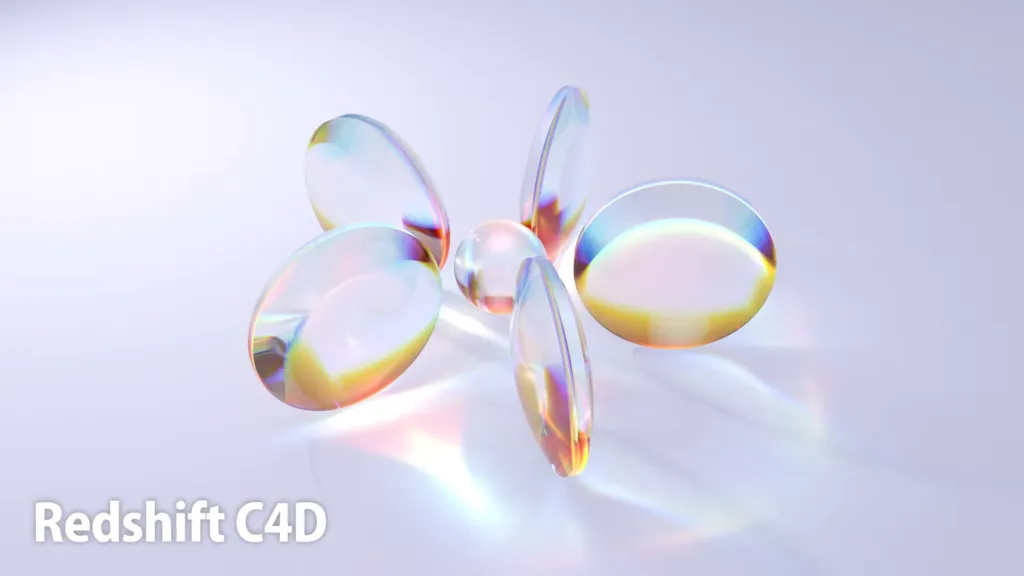 マテリアルの Transmission > Dispersion の数値を上げると虹色になる。数値が小さいほど色ズレが大きい。