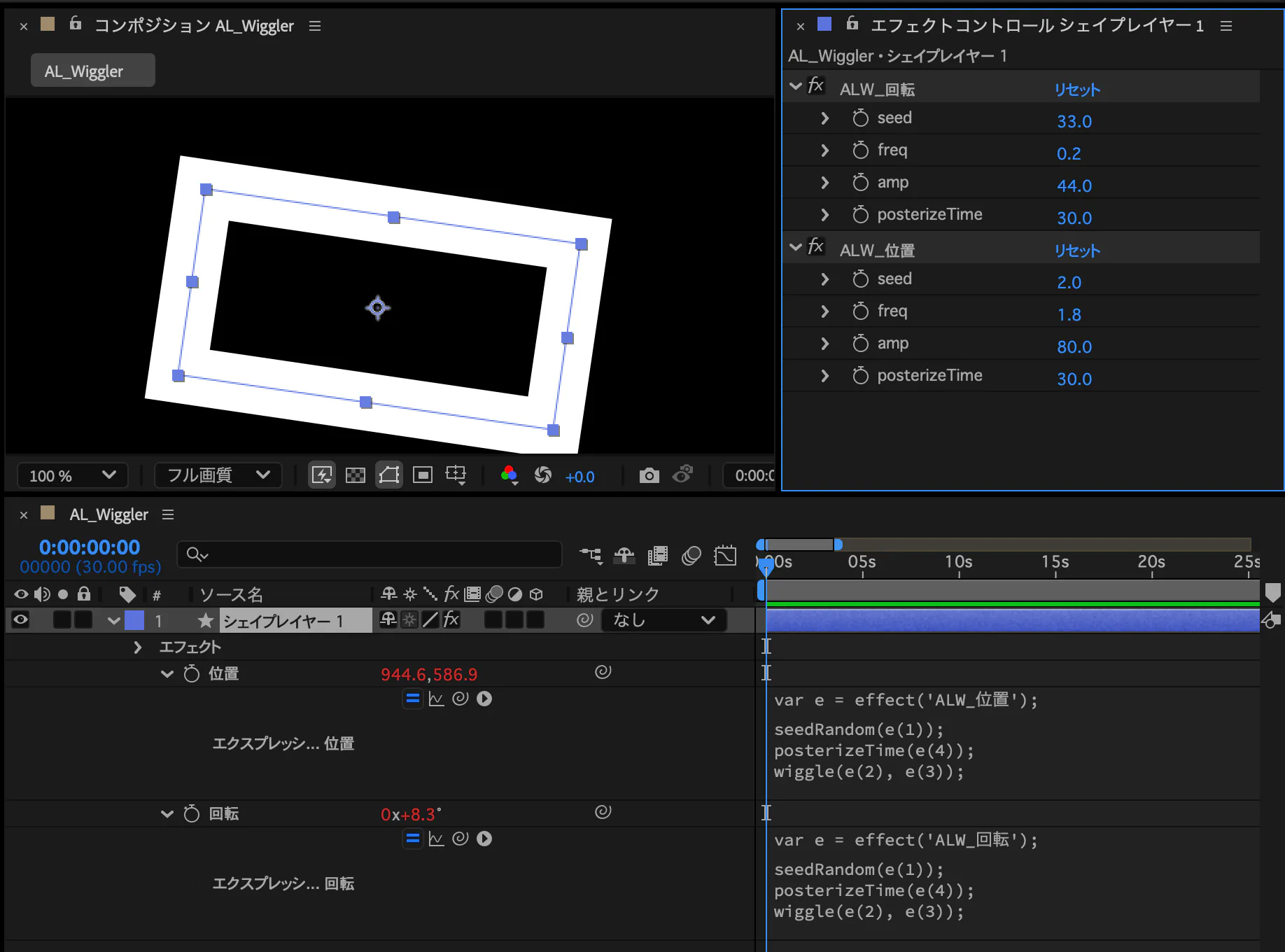 wiggleを追加したいプロパティを選択してスクリプトを実行。